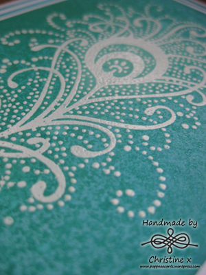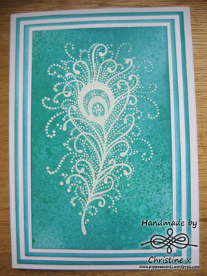 The stamp is called Cling Peacock Points from Stampendous. I heat embossed the image and then distressed the background with Peacock Feathers Distress Ink. I then sprayed over the top using Peacock Green Cosmic Shimmer Spray. I used the same Distress Ink to colour the layering mats as well so the colours matched perfectly