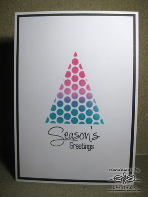 This was really simple to achieve, I used post its to mask off a triangular area and then taped down some sequin waste through which I blended Peacock Feathers and Picked Raspberry Distress Inks. The sentiment is from Clearly Besotted’s Signature Christmas stamp set – I love the handwriting and the sentiments from this stamp set have become my go to Christmas stamps.