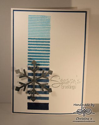I used the Basic Stripes stamps and Distress Inks in Tumbled Glass, Broken China, Faded Jeans and Chipped Sapphire. The sentiment is from Signature Christmas and the snowflake was cut from my Silhouette and embossed with silver embossing powder.