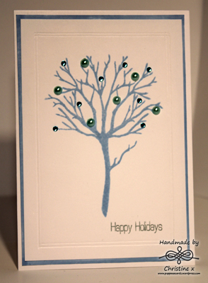 This second card was incredibly simple.  I used Memento ink in Summer Sky for the tree then added some bling and debossed a border around the tree using my scoring board.  The sentiment is from the Clearly Besotted Signature Christmas stamp set.