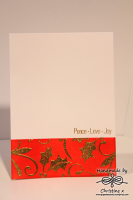 I switched up the ink colours to red and gold, but otherwise the card is the same. The sentiment is from Clearly Besotted’s Pretty Poinsettia stamp set.