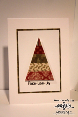 I love how simple this is. I just cut strips of patterned paper and adhered them to a piece of scrap card, then cut out my tree. I have used foam dots to add dimension and matt of the patterned paper to give definition. The best bit? I have enough of the strips to make several of these cards – quick and easy!