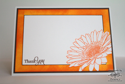 My husband gave me a fab new stamp set from Uniko Studio called Pure Florals: Gerbera. I used Distress Ink in Spiced Marmalade to create the border and stamped the image in Tangelo Memento Ink. The sentiment is from the same stamp set, stamped in Rich Cocoa Memento Ink.