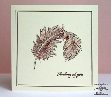 2. Be still my rapidly beating heart! This is Clean & Simple defined! Stunning simplicity, perfectly balanced design (love where you placed the sentiment), trendy products (feathers are sooooo in!), gorgeous coloring, impecable border (that I think is hand drawn). Absolute perfection!