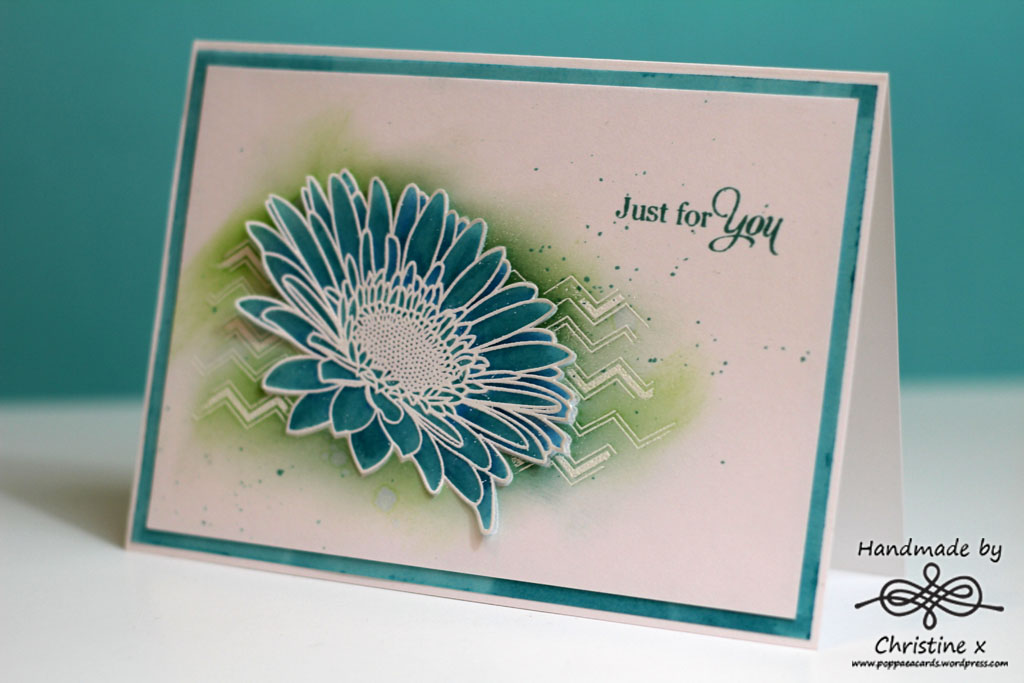 I stamped the Pure Florals: Gerbera image and the Background Builders: Chevrons image in Versamark and white embossed. I used a mask and then Distress Inks in Evergreen Bough, Pine Needles and Mowed Lawn to create a faded background over the images. I stamped the gerbera again onto vellum and embossed, then shaded the reverse side using Spectrum Noir pens. The sentiment is also from the Pure Florals set stamped in Evergreen Bough Distress ink.
