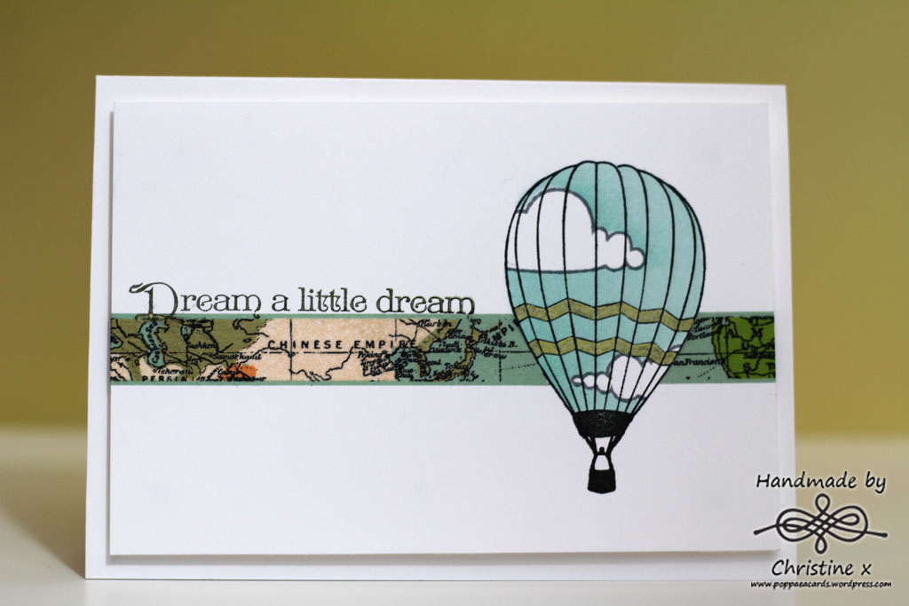 I knew I wanted to use my hot air balloon stamp which I got from Get Stamping magazine and I had recently been given some travel themed washi tape by my husband (he can’t help himself, he sees washi tape, he buys me washi tape).  I had a couple of ideas for a layout and after playing for a little settled on the above, but I had to backwards engineer the card in order to figure out how to do what I wanted.