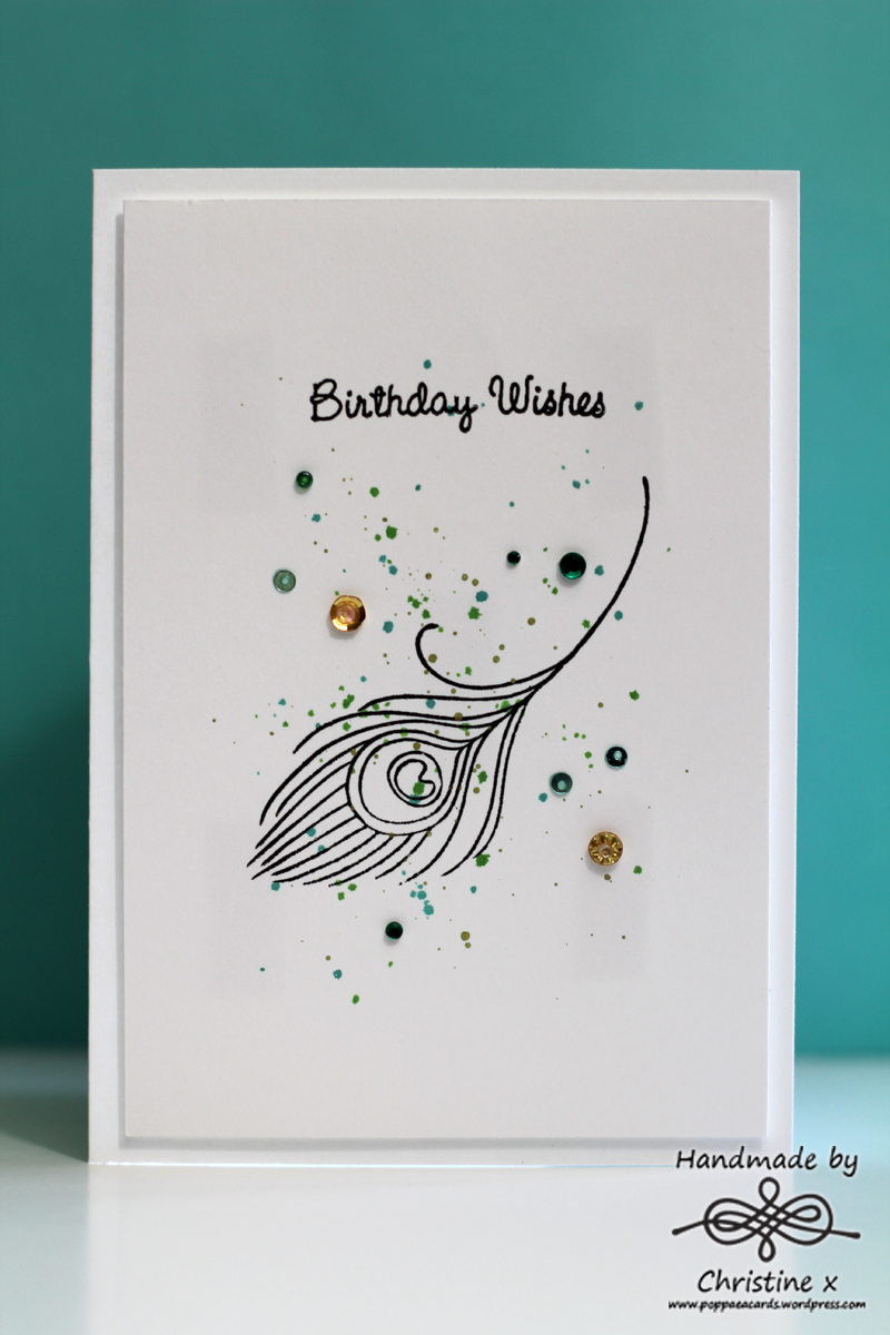 I used the single feather stamp from the Stampendous set, Jumbo Peacock. I then used Distress Inks in Peacock Feathers and Mowed Lawn, as well as Perfect Pearls in gold mixed with water to make the splatter spots – I did mask off an area around the feather so as to be able to control where the spots went. I then had a rummage through my sequin pot to find some bling to match.