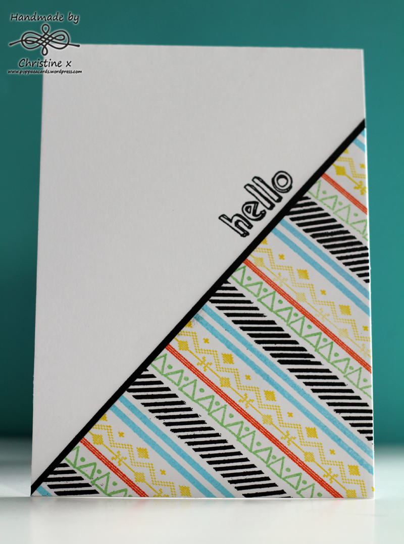 There is so much to inspire in this photo but I was drawn to the mix of prints and the bold use of colour. I combined a couple of stamp sets to create the striped section – Urban Stamps Christmas in the Country Fair Isle and Studio Calico Frame and Feathers.  I used a Stampamajig to line everything up on piece of card then cut a piece to size to layer onto the card front.  A strip of black cardstock and sentiment from the Studio Calico set finish it off.