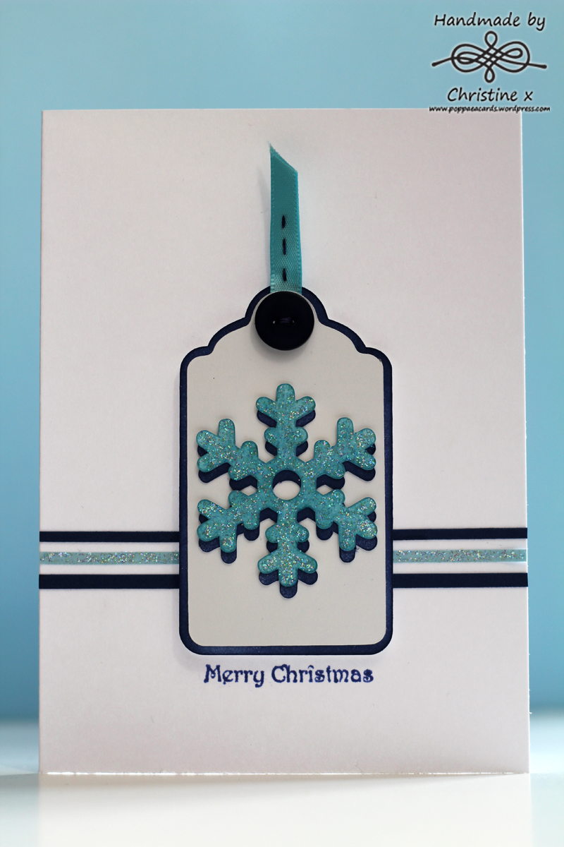 I cut two snowflakes from my Silhouette and coloured them with Distress Inks in Broken China and Chipped Sapphire.  I layered them at an offset with the darkest one behind to give the impression of a shadow, then decided the top snowflake needed something, so out came the Stickles.  I cut two different sizes of tag, shading one again with Distress Ink in Chipped Sapphire and then layered them up.  I added a ribbon then stitched on a button, running the stitching up the ribbon for a little added detail.