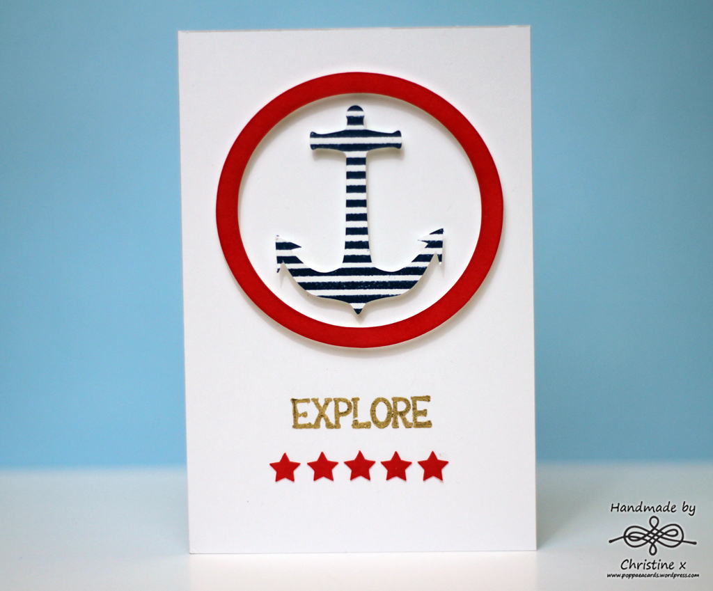 I used Clearly Besotted’s Basic Stripes and Memento ink in Nautical Blue to stamp the anchor, which was a die cut made using my Silhouette.  The frame and stars (also die cut) were inked using Distress Ink in Barn Door.  The sentiment is stamped and foiled – if I were to do this again I would use embossing powder to keep it simple as I couldn’t get the smooth finish I was looking for with the foil.