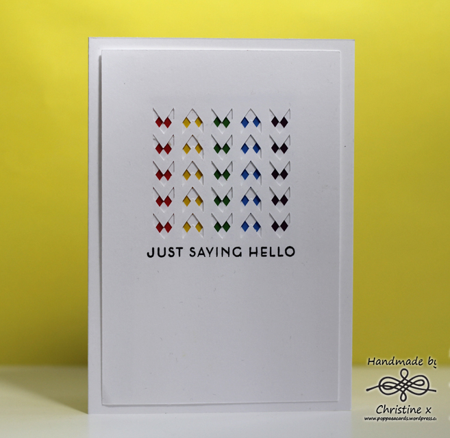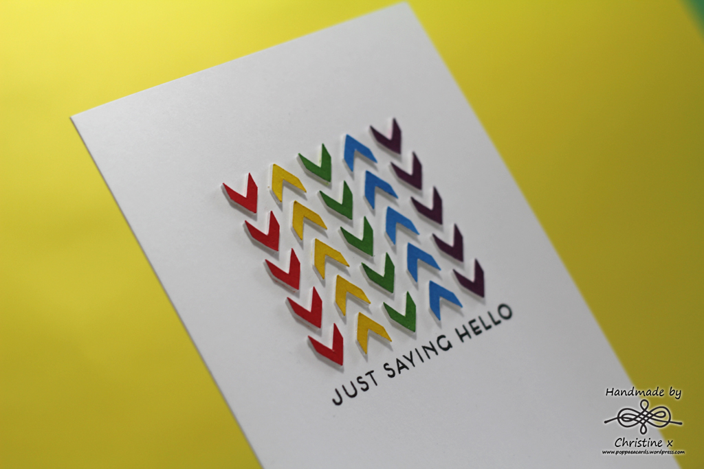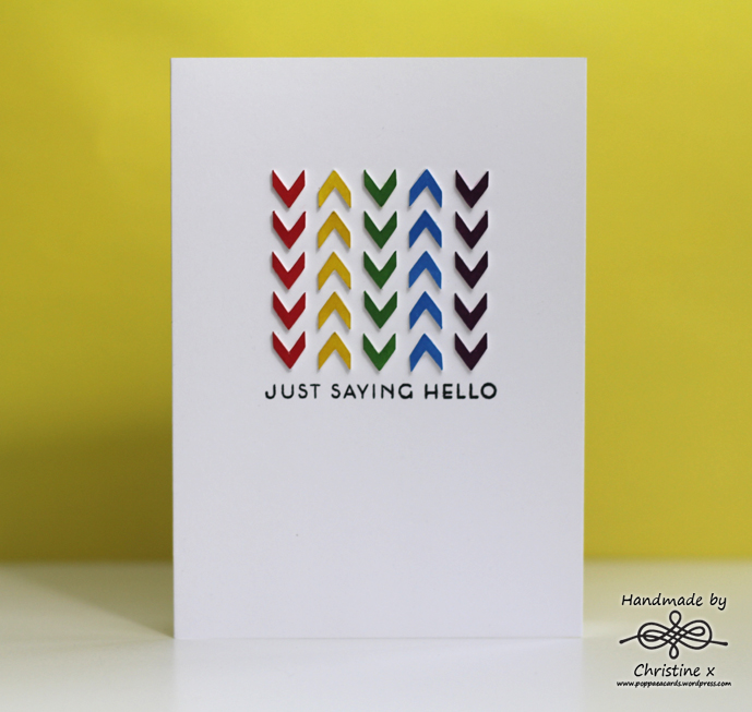 When I came up with my idea I thought it would be quick and simple to create, but how wrong I was.  I used my Silhouette to create 4 card layers with the arrows cut out and then inked up one of the cut outs with Distress Inks in Barn Door, Mustard Seed, Mowed Lawn, Salty Ocean and Seedless Preserves. So far, so good. The idea was to layer up the coloured arrows with the plain ones left over, creating depth on the final card: