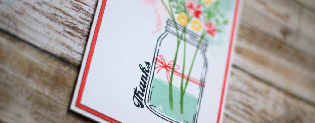 Firstly I stamped the images and then I stamped the flowers several times on a post-it and cut them out, in order to create masks. Once these were placed over the flowers, I then created the background by pressing an ink pad onto a piece of flimsy plastic, spraying with water and then pouncing the plastic onto the card front. I did this with two of the ink colours I had used for the image and it created a watercolour effect in the background, behind the flowers. When I stamped the sentiment, I inked up just the “Thanks” part of the sentiment (another way to stretch your stamps), and was able to stamp this as if it was hugging the corner of the jar.