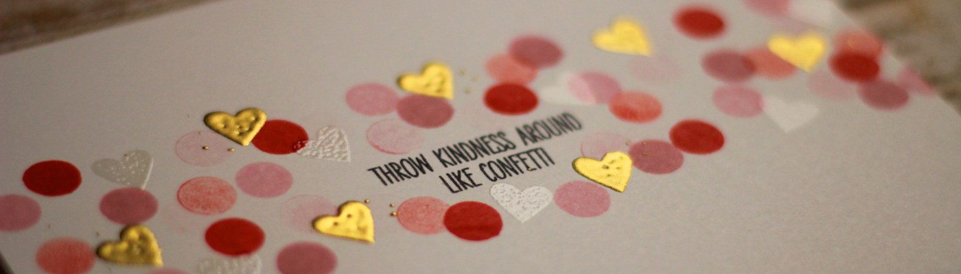 For this card I selected the gorgeous sentiment “throw kindness around like confetti” as my inspiration, and used the heart and dot stamps to create my confetti. I stamped the sentiment first to centralise it on the card, and then stamped the dot images in three different pink inks. In order to make it look like I have used more colours, I have done some second generation stamping, and this is a great way to get more from your stash. I then stamped the heart image in Versamark ink and used a gold embossing powder. Once this had cooled, I repeated this, but with a clear embossing powder instead (check out the feature image for the blog post, these really stand out here).