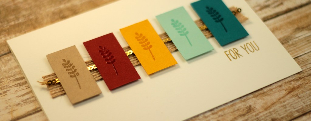 For my second card I wanted to use the same two stamps and basic elements and create a card with a completely different look. I chose an autumnal colour pallet and cut a small rectangle from a variety of cardstocks. I stamped in Versamark and embossed with a clear powder, to let the colours shine through. I adhered these using Dimensionals above a strip of burlap ribbon and gold sequin thread. The sentiment is embossed in gold to tie in with the sequins.