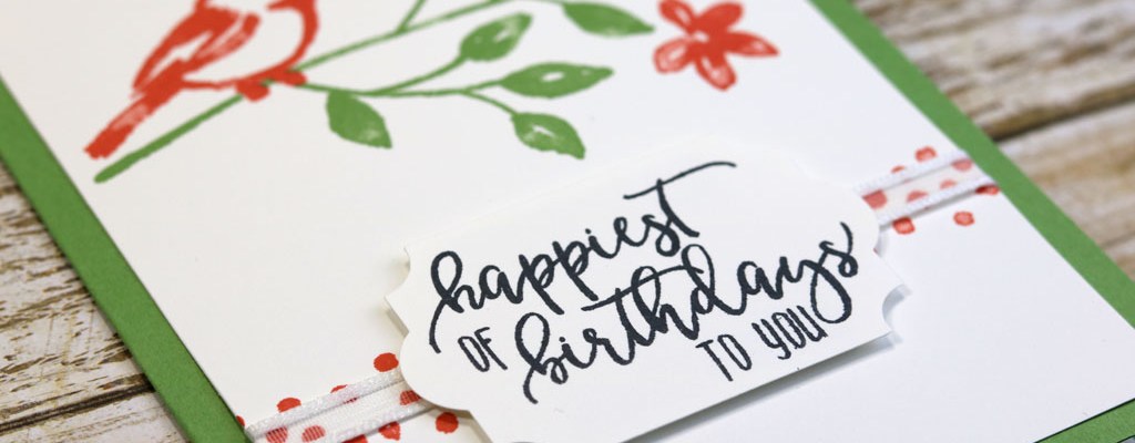 The Sentiment comes from the Picture Perfect stamp set – I love the font used for this sentiment and it seemed to fit well with the imagery.  I stamped the sentiment in Memento Tuxedo Black ink, then used the tag punch to cut it out.  I added the ribbon, then attached the tag using Dimensionals.  To finish the card, I matted the white card front onto a Wild Wasabi card base.